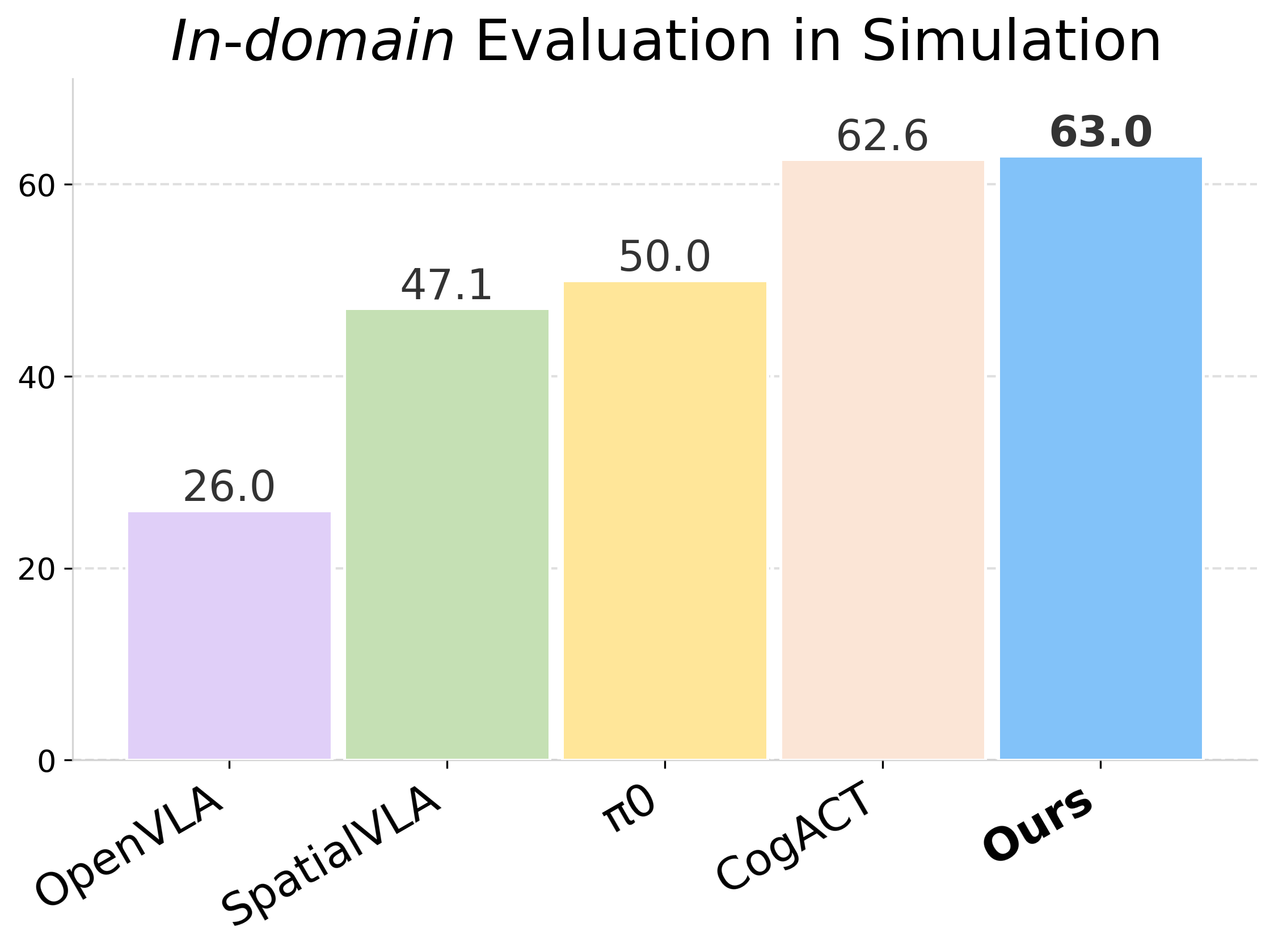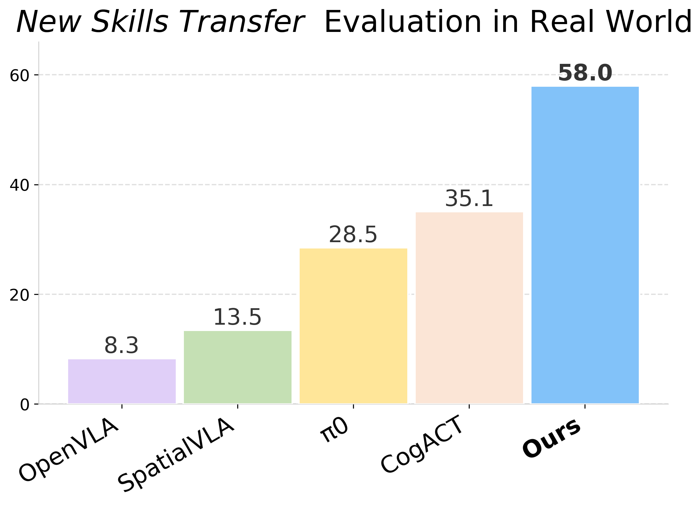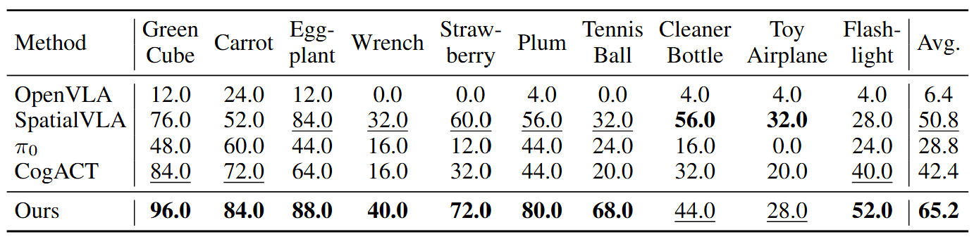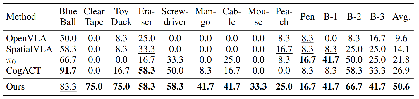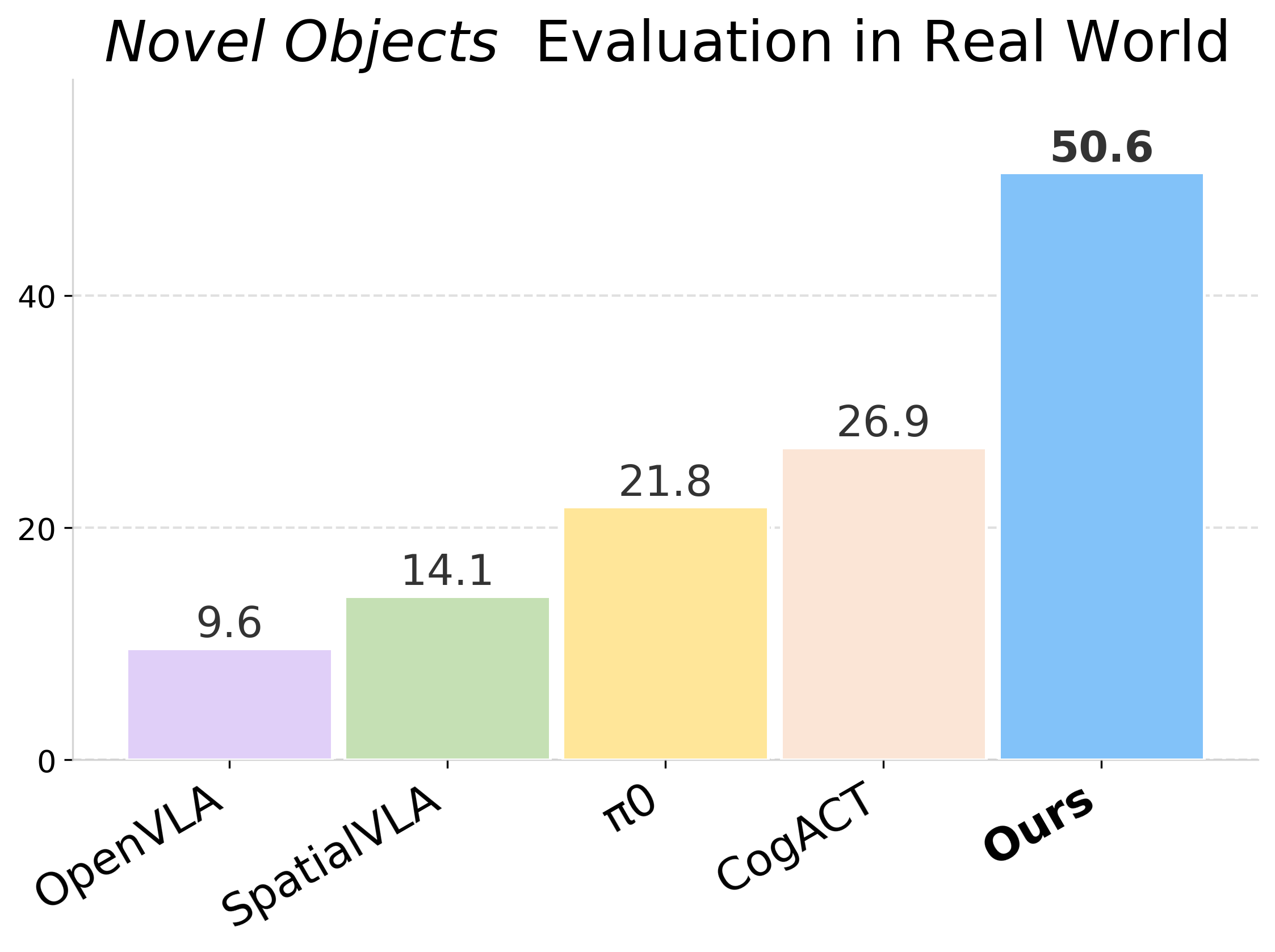 Using the Realman robot, we perform the task: “Pick up the [Novel Object] and place it onto the [Color] plate”, where each Novel Object is chosen from a set of novel objects not seen during finetuneing.