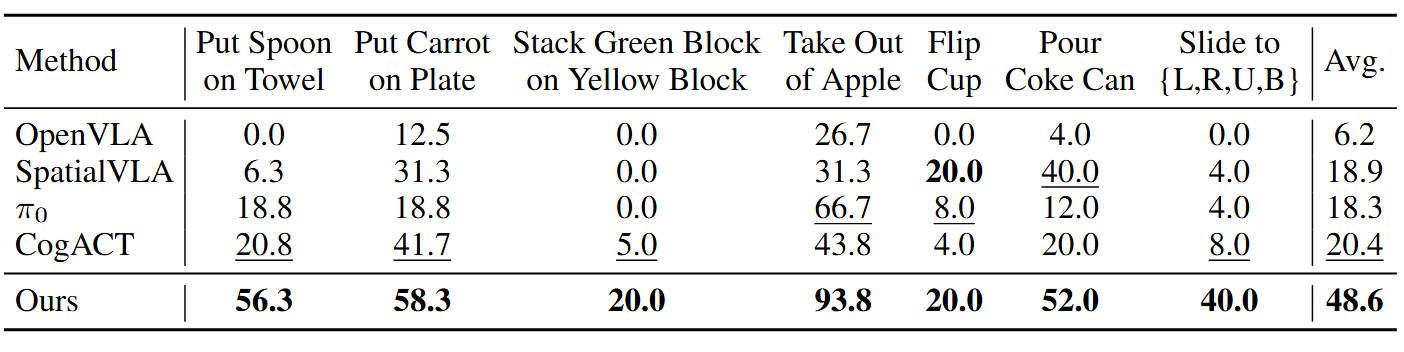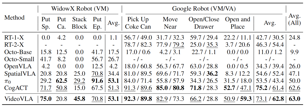 In-domain evaluation of VideoVLA and prior VLA models using the WidowX robot and Google robot within the SIMPLER simulation environment. All models are trained on the OXE dataset. |