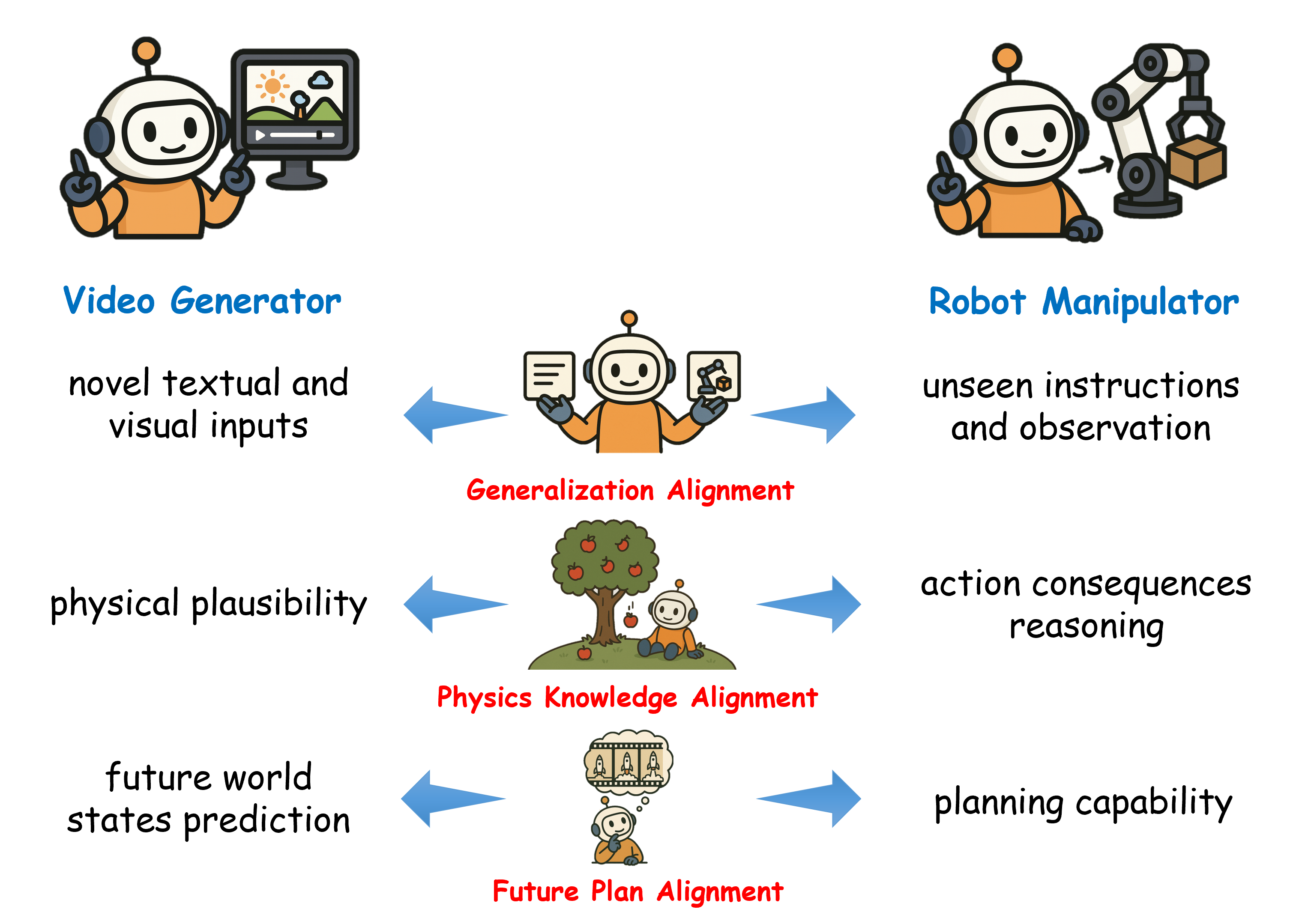 We found that there are three dimensions of alignment between video generator and robot manipulator. Firstly, the situation of video generators handling novel text and novel image conditions shows a natural alignment with that of robot manipulators dealing with unseen instructions and unseen observations. Secondly, the understanding of physical dynamics learned by video generators is also a fundamental capability required for any high-performing robotic manipulator to reason about the physical consequences of their generated actions. Furthermore, video generators can predict future world states by following given instructions, which inherently reflects a planning capability that is also crucial for robotic manipulation models to anticipate and organize their interactions with the physical environment. Motivated by these observations, we aim to explore the following question: "Can large video generators be seamlessly adapted into generalizable robotic manipulators?"