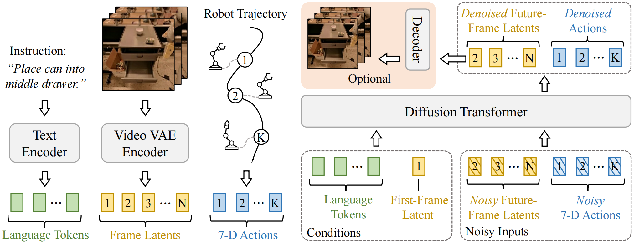 We evaluate VideoVLA with a Realman robot, which is equipped with a 7-DoF arm and a gripper, to perform real-world tasks such as picking, stacking, and placing objects. All models are finetuned on our collected dataset using the Realman robot.