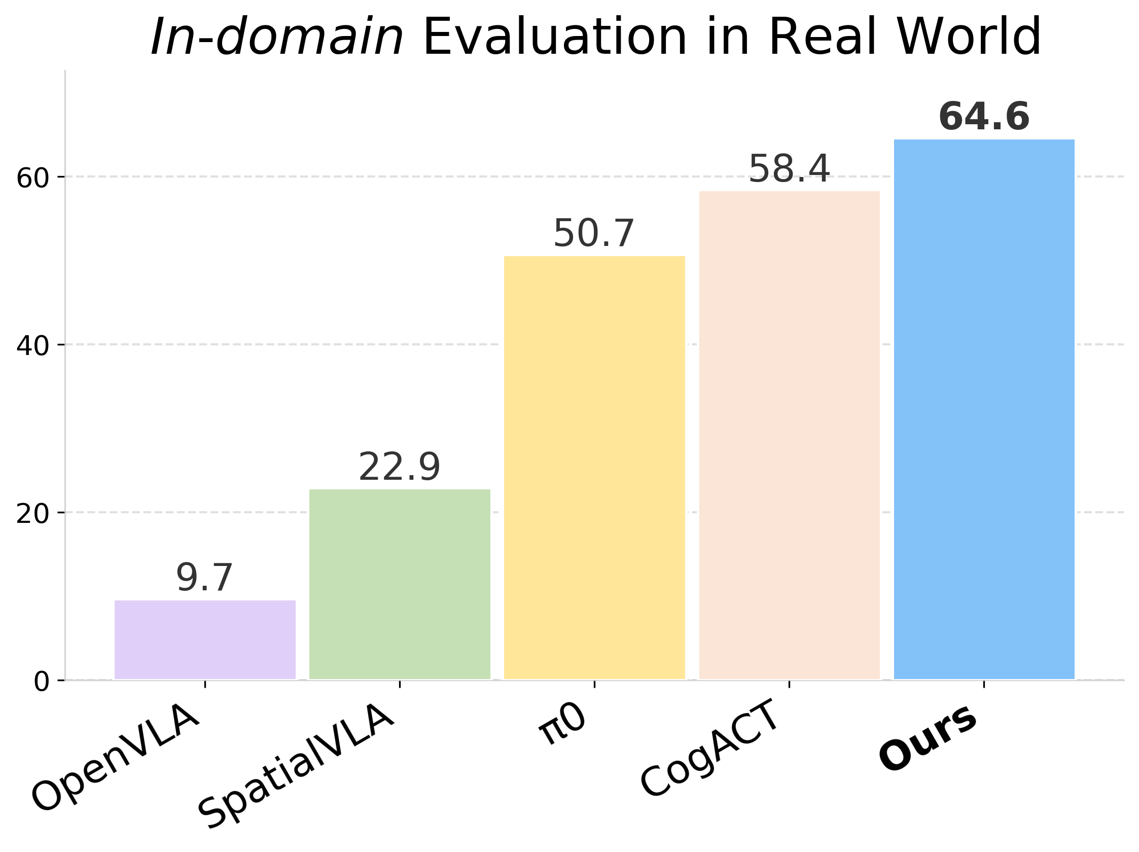 Real-world in-domain evaluation using the Realman robot. All models are pre-trained on the OXE dataset and subsequently fine-tuned on our collected dataset. |