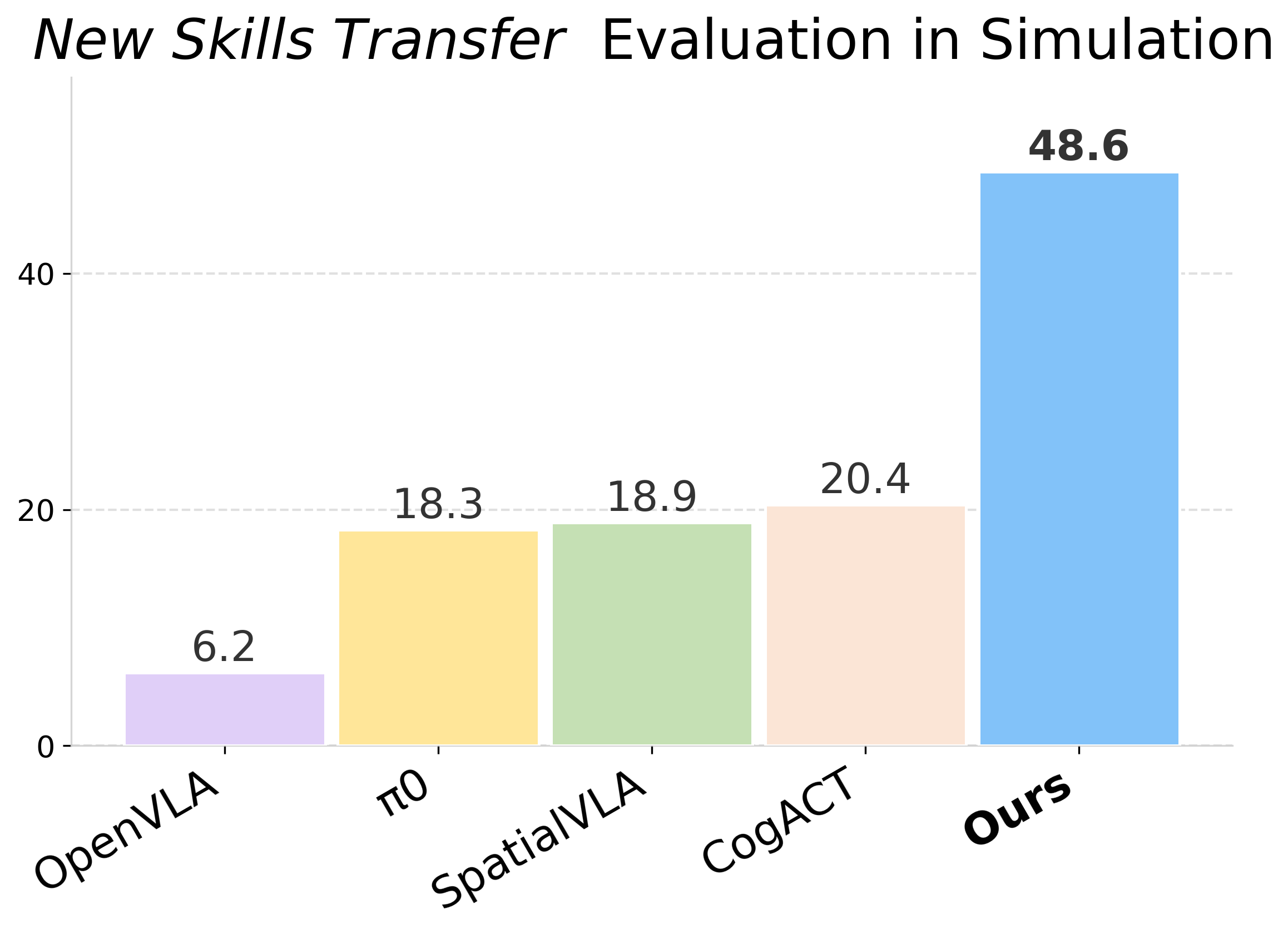 Evaluation of generalization to Skills Transfer using the Google robot within the SIMPLER environment. The new skills are transferred from the WidowX robot, as they are present in WidowX robot’s training data but absent from the Google robot’s training set. {L,R,U,B} denotes {Left, Right, Upper, Bottom}. |