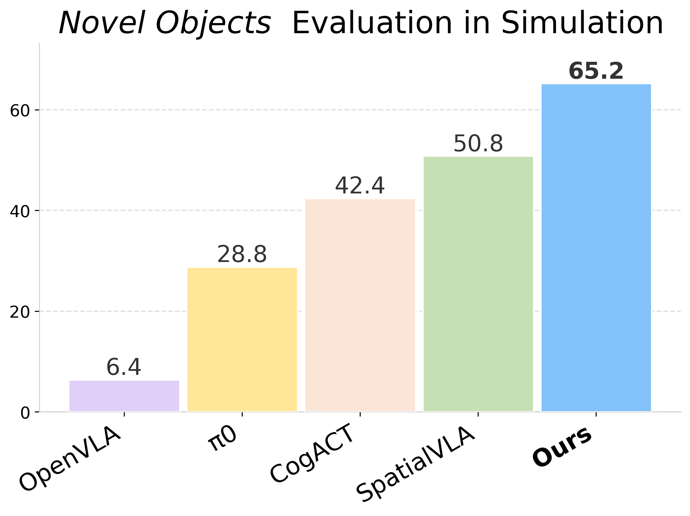 Evaluation of generalization to novel objects using the Google robot under the SIMPLER environment. |